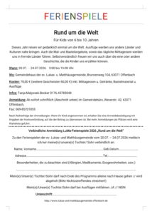 Dieses Jahr reisen wir gedanklich einmal um die Welt. Ausflüge werden uns andere Länder und Kulturen nahebringen. Auch die Mal- und Bastelangebote, sowie das tägliche Mittagessen werden uns in fremde Länder führen. Selbstverständlich freuen wir uns auch über die ein oder andere Geschichte, die die Kinder uns erzählen können.